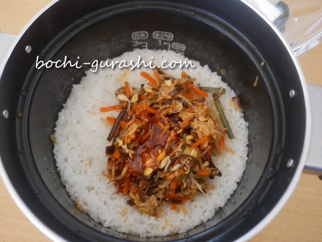 温かいごはんにビビンバの素をのせて混ぜるだけです。