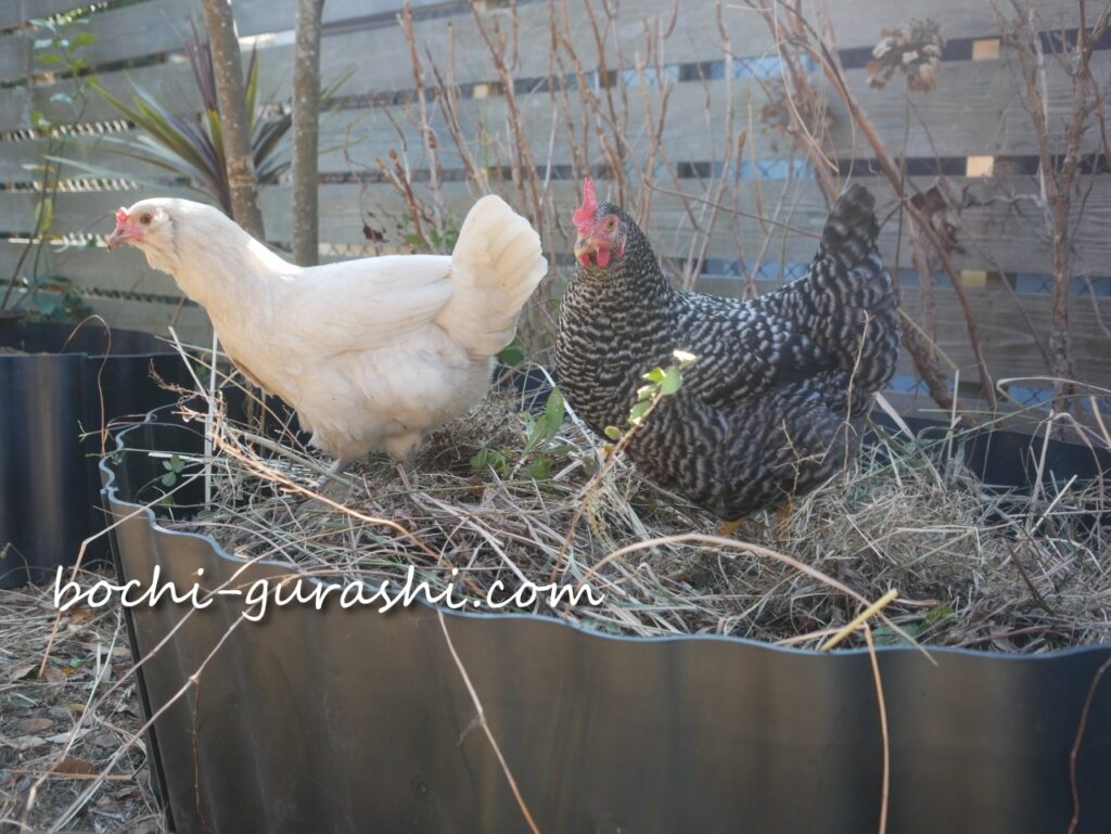 少しすっきりした庭と、ニワトリと、土いじりをする夫がいる風景は、今のわが家らしい光景です。
