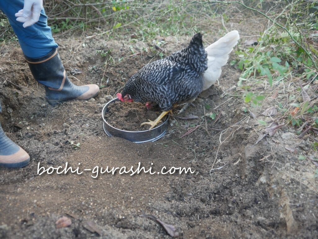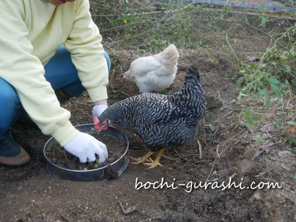 ニワトリと一緒に庭仕事をしていると、作業のスピードは確実に落ちます。