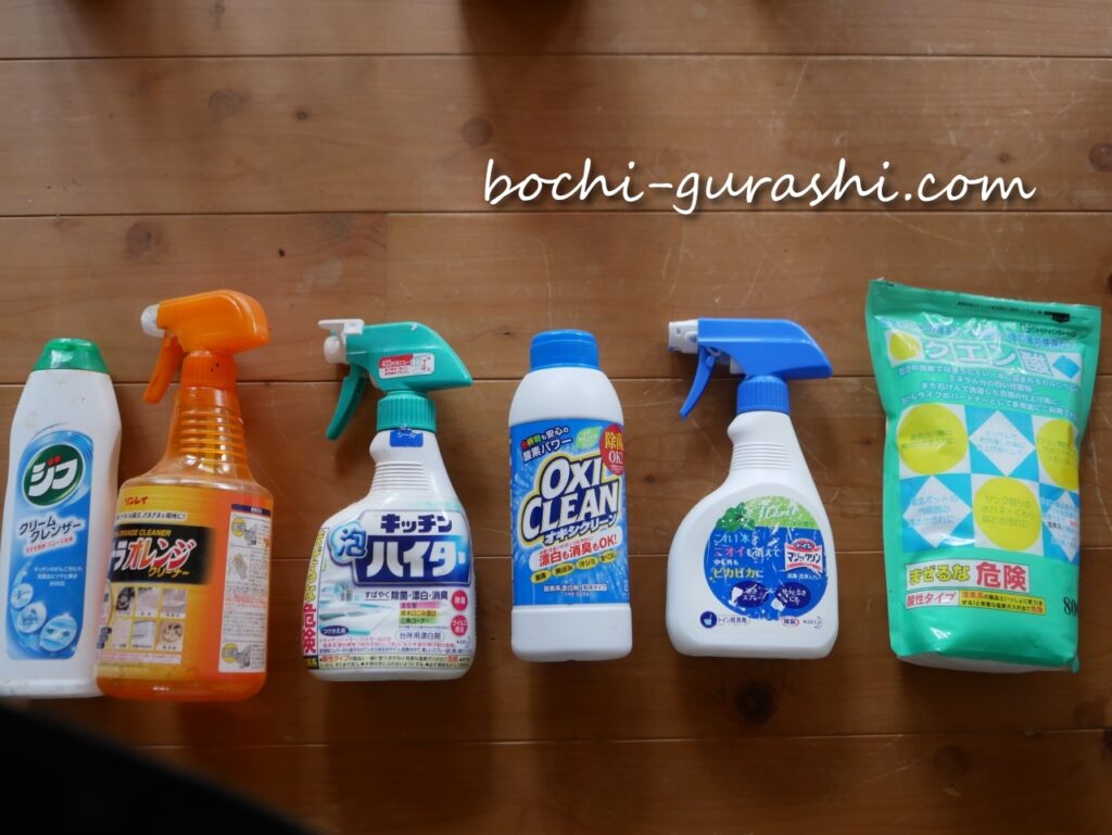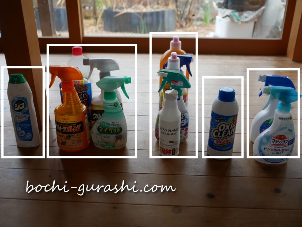 ちょっとわかりにくいものもあったのですが、左からクレンザー、アルカリ性の洗剤、除菌漂白(カビ取り)塩素系の洗剤、オキシクリーン、中性の洗剤です。