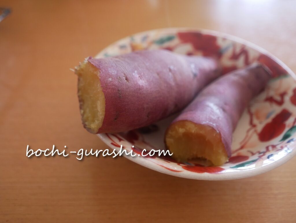 炊きあがりを待ちきれず、蒸している途中のふかしいも、柔らかそうなのをひとつ取り出して、そのままお皿へ。