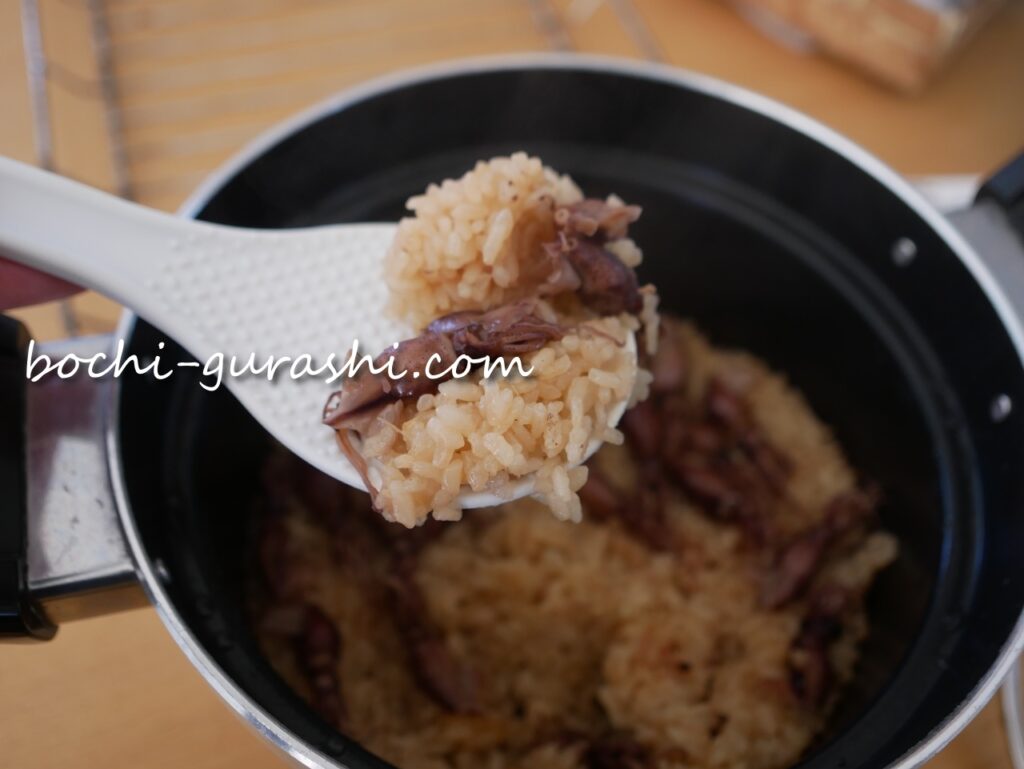 むらしが終わってふたを開けると、ふっくら炊きあがったホタルイカご飯。