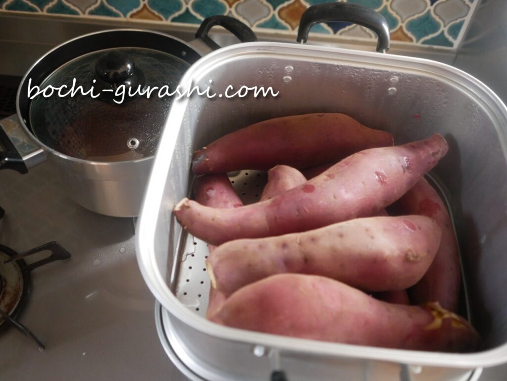 となりのコンロでは、干し芋用のさつまいもを蒸していて、台所がほんのり甘い湯気に包まれていました。