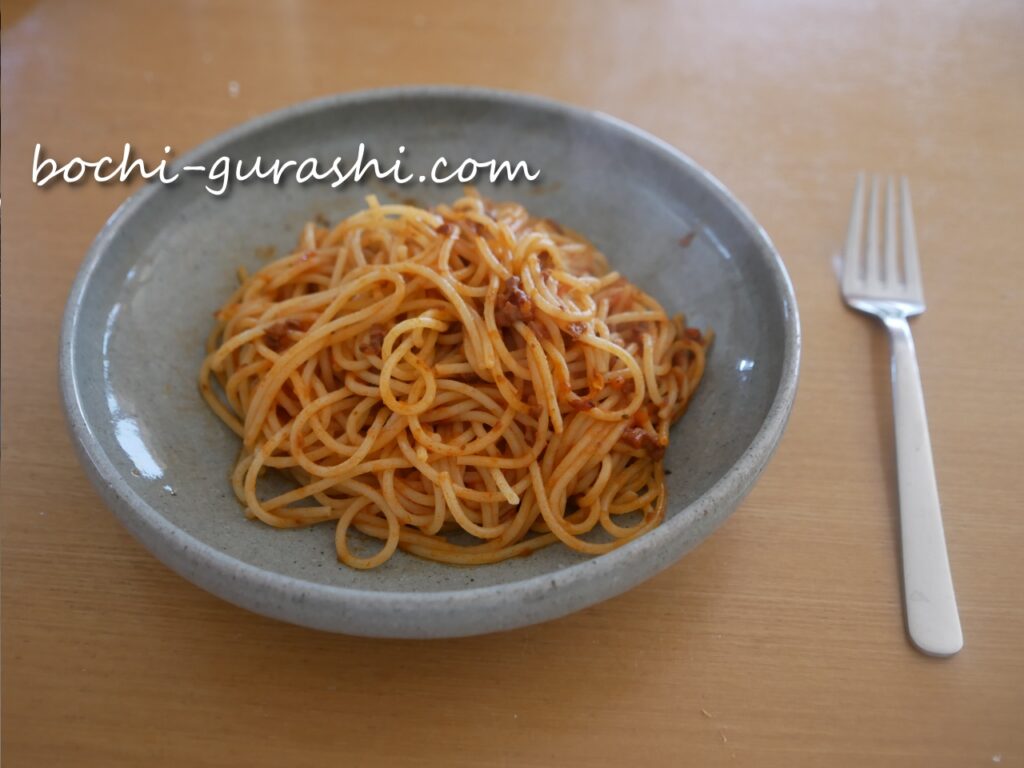 茹でたパスタ(目安80g)に、温めたソース(目安100g)を和えるだけです。