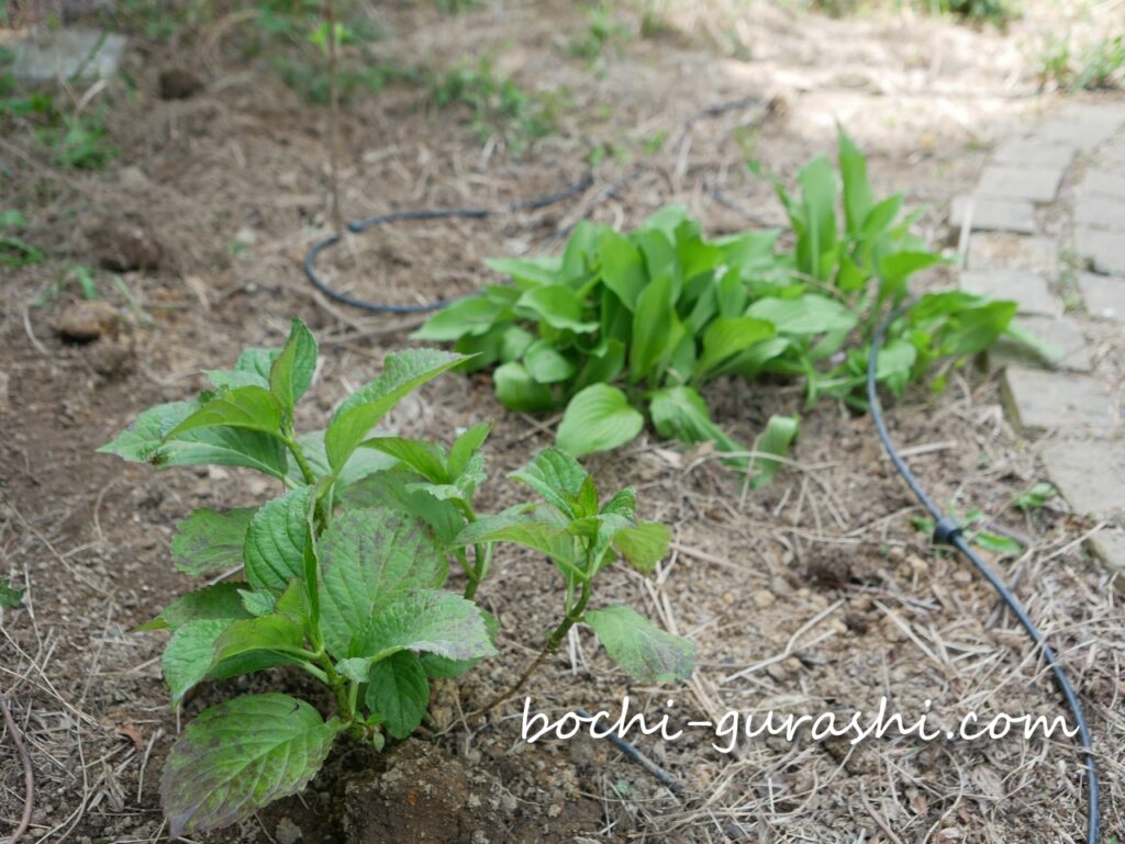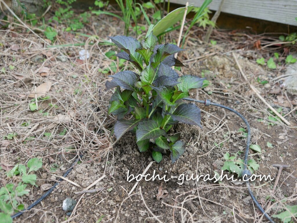 今回の主役は、大好きなアジサイ。 いつか大株に育ってほしいという願いを込めて、広めのスペースに地植えしました。