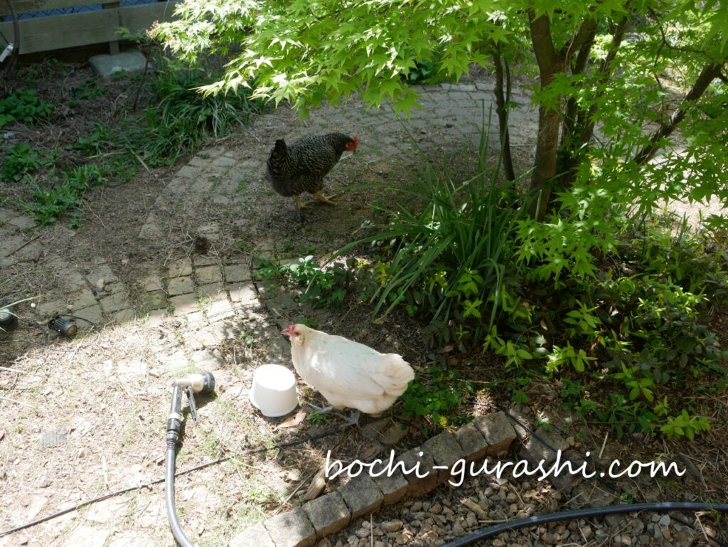 庭の様子とニワトリたち|芽を狙う“見回り隊”に注意